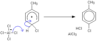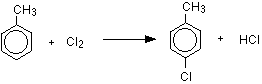 Substituting into the ring gives a mixture of 2-chloromethylbenzene and 4-chloromethylbenzene. The mechanisms are exactly the same as the substitution of chlorine into benzene - although you would have to be careful about the way you draw the intermediate ion. | |