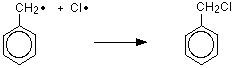 So what is the useful collision? If a phenylmethyl radical hits a chlorine molecule (something that's quite likely to occur), the following change can happen: The phenylmethyl radical takes one of the chlorine atoms to form (chloromethyl)benzene (which is what we want to make), but in the process generates another chlorine radical. This new chlorine radical can now go through the whole sequence again, and at the end will produce yet another chlorine radical - and so on and so on. The process is described as a free radical chain reaction. The chain continues because for every chlorine radical that goes in at the beginning, a new one is generated at the end. Chain termination Does this mean that one tiny burst of UV light, splitting one chlorine molecule into two free radicals, is enough to convert a whole reactions-worth of methylbenzene and chlorine into (chloromethyl)benzene and HCl? Sadly, no! As we've seen, there are collisions which result in the removal of free radicals without producing any new ones. These radicals can only be replaced by starting the process all over again with a new burst of light energy. In practice, then, the chains propagate many thousands of times, but eventually any chain will be brought to an end by one of these chain termination processes. Simplifying all this for exam purposes: The over-all process is known as free radical substitution, or as a free radical chain reaction. Chain initiation