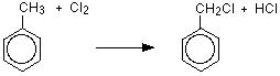 The organic product is (chloromethyl)benzene. The brackets in the name emphasise that the chlorine is part of the attached methyl group, and isn't on the ring. One of the hydrogen atoms in the methyl group has been replaced by a chlorine atom, so this is a substitution reaction. However, the reaction doesn't stop there, and all three hydrogens in the methyl group can in turn be replaced by chlorine atoms. Multiple substitution is dealt with on a separate page, and you will find a link to that at the bottom of this page. | |||||