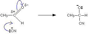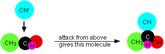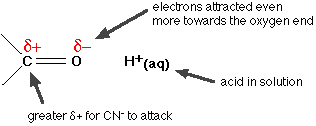 EXPLAINING THE NUCLEOPHILIC ADDITION OF HYDROGEN CYANIDE TO ALDEHYDES AND KETONES This page explains the mechanism for the nucleophilic addition reaction between carbonyl compounds (specifically aldehydes and ketones) and hydrogen cyanide. It also looks in some detail at why a racemic mixture is formed when hydrogen cyanide reacts with an aldehyde like ethanal. Background Bonding in the carbonyl group: the carbon-oxygen double bond Oxygen is far more electronegative than carbon and so has a strong tendency to pull electrons in a carbon-oxygen bond towards itself. One of the two pairs of electrons that make up a carbon-oxygen double bond is even more easily pulled towards the oxygen. That makes the carbon-oxygen double bond very highly polar. | ||