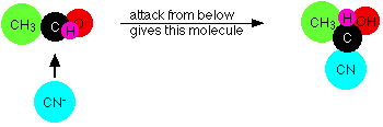 Optical isomerism occurs in compounds which have four different groups attached to a single carbon atom. In this case, the product molecule contains a CH3, a CN, an H and an OH all attached to the central carbon atom. The reason for the formation of equal amounts of two isomers lies in the way the ethanal gets attacked. Ethanal is a planar molecule, and attack by a cyanide ion will either be from above the plane of the molecule, or from below. There is an equal chance of either happening. Attack from above will lead to one of the two isomers, and attack from below will lead to the other. The next diagram shows what happens if attack is from above the plane of the molecule. Notice that the existing groups get forced down away from the approaching cyanide ion. The diagram shows the final product after it has gained a hydrogen ion. Attack from below forces the existing groups upwards. Why are these two product molecules different from each other? Everything seems to be attached in the same way, but look what happens if you rotate the second molecule in space so that the cyanide group is at the top. Now compare that with the molecule formed by attack from above. They aren't the same! Although the CN and H are lined up the same way, the CH3 and OH are reversed. There is no way that you can rotate one molecule in space to make it look the same as the other one. These are therefore isomers. The relationship between them is that they are mirror images of each other. If one isomer were to look in a mirror, what it would see would be the other one. Optical isomers are described as "non-superimposable mirror images". Because there is an equal chance of the attack coming from above or below the plane of the molecule, then you will get equal amounts of the two isomers formed - a racemic mixture. This argument applies to all aldehydes (apart from methanal), and to ketones as long as they are unsymmetric - with a different alkyl group either side of the carbonyl group. A symmetric ketone like propanone, CH3COCH3, will only produce a single product - not a mixture of isomers. The product doesn't have four different groups around the central carbon atom, and so won't have optical isomers. If you followed the above argument through with propanone, you would find that you ended up with two molecules which could be rotated in space so that they were identical. Convince yourself by trying it! | ||