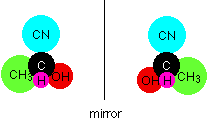 The mechanism for the addition of HCN to ethanal Exactly as before, as the cyanide ion approaches the slightly positive carbon atom, the lone pair of electrons is attracted towards the carbon and forms a bond with it. At the same time the two electrons in one of the bonds joining the carbon to the oxygen are repelled until they end up entirely on the oxygen - giving it a negative charge. The negative ion formed then picks up a hydrogen ion from somewhere - for example, from a hydrogen cyanide molecule. Once again, most sources show this final stage as a reaction with just H+. If you must do it that way, then write the hydrogen ion as H+(aq) - not just as H+. Optical isomerism in 2-hydroxypropanenitrile 2-hydroxypropanenitrile is the name of the product when ethanal reacts with hydrogen cyanide. It is formed in this reaction as an exactly equal mixture of two optical isomers, known as a racemic mixture. | ||