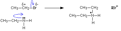The lone pair on the nitrogen in the primary amine attacks the + carbon exactly the same as the ammonia did. Bromine is lost as a bromide ion, and the immediate product is a salt called diethylammonium bromide - (CH3CH2)2NH2+ Br-. This is essentially ammonium bromide in which two of the hydrogens attached to the nitrogen have been replaced by ethyl groups.