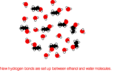 However, when the molecules are mixed, new hydrogen bonds are made between water molecules and ethanol molecules.