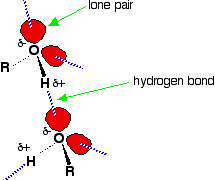 Note:  If you want to be fussy, the diagram is slightly misleading in that it suggests that all of the lone pairs on the oxygen atoms are forming hydrogen bonds. In an alcohol that can't happen. Taking the alcohol as a whole, there are only half as many slightly positive hydrogen atoms as there are lone pairs. At any one time, half of the lone pairs in the total liquid alcohol won't have hydrogen bonds from them because there aren't enough slightly positive hydrogens to go around.