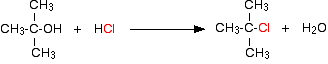 Reaction with hydrogen chloride Tertiary alcohols react reasonably rapidly with concentrated hydrochloric acid, but for primary or secondary alcohols the reaction rates are too slow for the reaction to be of much importance. A tertiary alcohol reacts if it is shaken with concentrated hydrochloric acid at room temperature. A tertiary halogenoalkane (haloalkane or alkyl halide) is formed