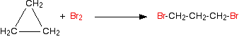 In the absence of UV light, cyclopropane can undergo addition reactions in which the ring is broken. For example, with bromine, cyclopropane gives 1,3-dibromopropane.