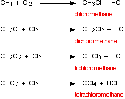 Substitution reactions happen in which hydrogen atoms in the methane are replaced one at a time by chlorine atoms. You end up with a mixture of chloromethane, dichloromethane, trichloromethane and tetrachloromethane.