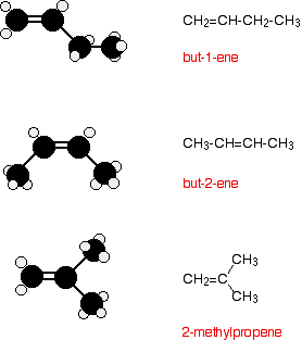You can work out the formula of any of them using: CnH2n The table is limited to the first two, because after that there are isomers which affect the names. Isomerism in the alkenes Structural isomerism All the alkenes with 4 or more carbon atoms in them show structural isomerism. This means that there are two or more different structural formulae that you can draw for each molecular formula. For example, with C4H8, it isn't too difficult to come up with these three structural isomers: