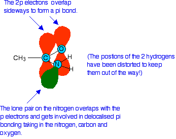 We need to look at the bonding in the -CONH2 group. Like any other double bond, a carbon-oxygen double bond is made up of two different parts. One electron pair is found on the line between the two nuclei - this is known as a sigma bond. The other electron pair is found above and below the plane of the molecule in a pi bond. A pi bond is made by sideways overlap between p orbitals on the carbon and the oxygen. In an amide, the lone pair on the nitrogen atom ends up almost parallel to these p orbitals, and overlaps with them as they form the pi bond.