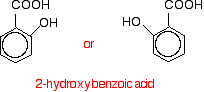 Looking at it this way, notice that the hydrogen of the phenol -OH group has been replaced by an acyl group - an alkyl group attached to a carbon-oxygen double bond. You can say that the phenol has been acylated or has undergone acylation. Because of the nature of this particular acyl group, it is also described as ethanoylation. The hydrogen is being replaced by an ethanoyl group, CH3CO-. Using a similar reaction to make aspirin The reaction with phenol itself isn't very important, but you can make aspirin by a very similar reaction. The molecule below is 2-hydroxybenzoic acid (also known as 2-hydroxybenzenecarboxylic acid). The old name for this is salicylic acid. You might find it written in either of these two ways. They are the same structure with the molecule just flipped over in space.
