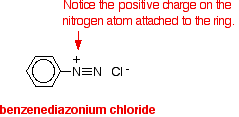 Note: I've drawn the diazonium ion with the -N2+ group at the side for two reasons. First, because it is easier to show that the benzene ring and the two nitrogen atoms lie in a straight line. Secondly, because that's the way I shall need to draw it in some of its reactions to make certain structures clear. | ||