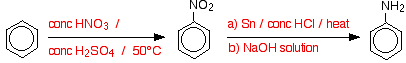 Note: The conversion of nitrobenzene into phenylamine is so time-consuming, complicated, and hazardous at this level that I'm not going to make any attempt to describe this in detail. If you want details, refer to any good practical organic chemistry textbook. | ||