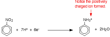 Nitrobenzene to phenylamine The conversion is done in two main stages: Stage 1: conversion of nitrobenzene into phenylammonium ions Nitrobenzene is reduced to phenylammonium ions using a mixture of tin and concentrated hydrochloric acid. The mixture is heated under reflux in a boiling water bath for about half an hour. Under the acidic conditions, rather than getting phenylamine directly, you instead get phenylammonium ions formed. The lone pair on the nitrogen in the phenylamine picks up a hydrogen ion from the acid. The electron-half-equation for this reaction is: