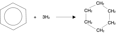 However, for these hydrocarbons, combustion is hardly ever complete, especially if they are burnt in air. The high proportion of carbon in the molecules means that you need a very high proportion of oxygen to hydrocarbon to get complete combustion. Look at the equations. As a general rule, the hydrogen in a hydrocarbon tends to get what oxygen is available first, leaving the carbon to form carbon itself, or carbon monoxide, if there isn't enough oxygen to go round. The arenes tend to burn in air with extremely smoky flames - full of carbon particles. You almost invariably get incomplete combustion, and the arenes can be recognised by the smokiness of their flames. Hydrogenation Hydrogenation is an addition reaction in which hydrogen atoms are added all the way around the benzene ring. A cycloalkane is formed. For example: With benzene: