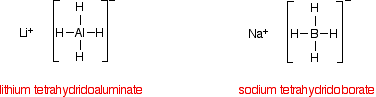 REDUCTION OF ALDEHYDES AND KETONES This page looks at the reduction of aldehydes and ketones by two similar reducing agents - lithium tetrahydridoaluminate(III) (also known as lithium aluminium hydride) and sodium tetrahydridoborate(III) (sodium borohydride). Background to the reactions The reducing agents Despite the fearsome names, the structures of the two reducing agents are very simple. In each case, there are four hydrogens ("tetrahydido") around either aluminium or boron in a negative ion (shown by the "ate" ending). The "(III)" shows the oxidation state of the aluminium or boron, and is often left out because these elements only ever show the +3 oxidation state in their compounds. To make the names shorter, that's what I shall do for the rest of this page. | ||