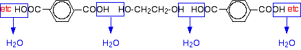 Note: This does NOT describe the way the actual reaction happens - it is a way of working out the structure of the polymer. The chemistry of the reaction is more complicated than this. The diagram shows a slightly shorter bit of chain than the corresponding one at the top of the page. However, it is exactly consistent with the loss of water from the last diagram. It was impossible to include another ethane-1,2-diol in that diagram for space reasons. If any of this offends you, draw it again yourself so that everything matches! In fact, it would be good practice to draw a bit of chain starting from a few more monomers. This is what I meant further up the page by working the structure out rather than remembering it. The structures of both monomers are easy to remember. If you line them up and remove water as I have shown, the structure follows automatically. | ||