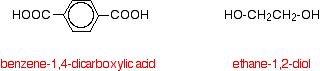 The diagram shows a very small bit of the polymer chain and looks pretty complicated. But it isn't very difficult to work out - and that's the best thing to do: work it out, not try to remember it. You will see how to do that in a moment. The usual name of this common polyester is poly(ethylene terephthalate). The everyday name depends on whether it is being used as a fibre or as a material for making things like bottles for soft drinks. When it is being used as a fibre to make clothes, it is often just called polyester. It may sometimes be known by a brand name like Terylene. When it is being used to make bottles, for example, it is usually called PET. Making polyesters as an example of condensation polymerisation In condensation polymerisation, when the monomers join together a small molecule gets lost. That's different from addition polymerisation which produces polymers like poly(ethene) - in that case, nothing is lost when the monomers join together. A polyester is made by a reaction involving an acid with two -COOH groups, and an alcohol with two -OH groups. In the common polyester drawn above: The acid is benzene-1,4-dicarboxylic acid (old name: terephthalic acid). The alcohol is ethane-1,2-diol (old name: ethylene glycol).