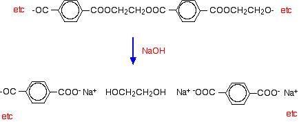 Hydrolysis of polyesters Simple esters are easily hydrolysed by reaction with dilute acids or alkalis. Polyesters are attacked readily by alkalis, but much more slowly by dilute acids. Hydrolysis by water alone is so slow as to be completely unimportant. (You wouldn't expect your polyester fleece to fall to pieces if you went out in the rain!) If you spill dilute alkali on a fabric made from polyester, the ester linkages are broken. Ethane-1,2-diol is formed together with the salt of the carboxylic acid. Because you produce small molecules rather than the original polymer, the fibres are destroyed, and you end up with a hole! For example, if you react the polyester with sodium hydroxide solution: