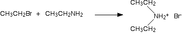 The current page summarises the main facts about the reactions. If you need details about the mechanisms, you will find a link below. Reaction details and products The halogenoalkane is heated with a concentrated solution of ammonia in ethanol. The reaction is carried out in a sealed tube. You couldn't heat this mixture under reflux, because the ammonia would simply escape up the condenser as a gas. We'll talk about the reaction using 1-bromoethane as a typical primary halogenoalkane. There is no difference in the details of the reaction if you chose a secondary or tertiary halogenoalkane instead. The equations would just look more complicated than they already are! You get a series of amines formed together with their salts. The reactions happen one after another. Making a primary amine The reaction happens in two stages. In the first stage, a salt is formed - in this case, ethylammonium bromide. This is just like ammonium bromide, except that one of the hydrogens in the ammonium ion is replaced by an ethyl group.