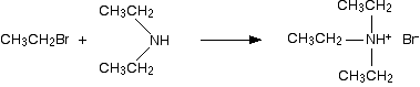 The ammonia removes a hydrogen ion from the diethylammonium ion to leave a secondary amine - diethylamine. A secondary amine is one which has two alkyl groups attached to the nitrogen. Making a tertiary amine And still it doesn't stop! The diethylamine also reacts with bromoethane - in the same two stages as before. In the first stage, you get triethylammonium bromide.