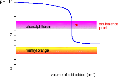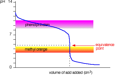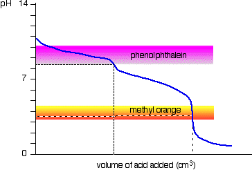 You can see that neither indicator is any use. Phenolphthalein will have finished changing well before the equivalence point, and methyl orange falls off the graph altogether. It may be possible to find an indicator which starts to change or finishes changing at the equivalence point, but because the pH of the equivalence point will be different from case to case, you can't generalise. On the whole, you would never titrate a weak acid and a weak base in the presence of an indicator. Sodium carbonate solution and dilute hydrochloric acid This is an interesting special case. If you use phenolphthalein or methyl orange, both will give a valid titration result - but the value with phenolphthalein will be exactly half the methyl orange one.