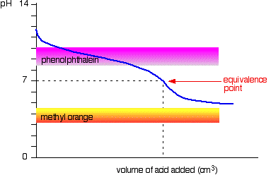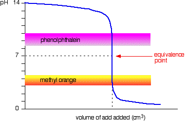 For example, methyl orange would be yellow in any solution with a pH greater than 4.4. It couldn't distinguish between a weak acid with a pH of 5 or a strong alkali with a pH of 14. Choosing indicators for titrations Remember that the equivalence point of a titration is where you have mixed the two substances in exactly equation proportions. You obviously need to choose an indicator which changes colour as close as possible to that equivalence point. That varies from titration to titration. Strong acid v strong base The next diagram shows the pH curve for adding a strong acid to a strong base. Superimposed on it are the pH ranges for methyl orange and phenolphthalein.