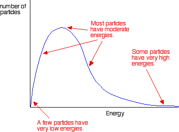 If the particles collide with less energy than the activation energy, nothing important happens. They bounce apart. You can think of the activation energy as a barrier to the reaction. Only those collisions which have energies equal to or greater than the activation energy result in a reaction. Any chemical reaction results in the breaking of some bonds (needing energy) and the making of new ones (releasing energy). Obviously some bonds have to be broken before new ones can be made. Activation energy is involved in breaking some of the original bonds. Where collisions are relatively gentle, there isn't enough energy available to start the bond-breaking process, and so the particles don't react. The Maxwell-Boltzmann Distribution Because of the key role of activation energy in deciding whether a collision will result in a reaction, it would obviously be useful to know what sort of proportion of the particles present have high enough energies to react when they collide. In any system, the particles present will have a very wide range of energies. For gases, this can be shown on a graph called the Maxwell-Boltzmann Distribution which is a plot of the number of particles having each particular energy. | ||