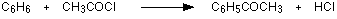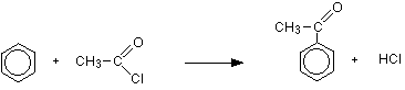 The most reactive substance containing an acyl group is an acyl chloride (also known as an acid chloride). Benzene is treated with a mixture of ethanoyl chloride, CH3COCl, and aluminium chloride as the catalyst. A ketone called phenylethanone is formed. | |||