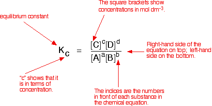 EQUILIBRIUM CONSTANTS: Kc This page explains what is meant by an equilibrium constant, introducing equilibrium constants expressed in terms of concentrations, Kc. It assumes that you are familiar with the concept of a dynamic equilibrium, and know what is meant by the terms "homogeneous" and "heterogeneous" as applied to chemical reactions. | ||