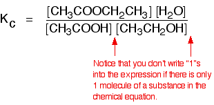 Compare this with the chemical equation for the equilibrium. The convention is that the substances on the right-hand side of the equation are written at the top of the Kc expression, and those on the left-hand side at the bottom. The indices (the powers that you have to raise the concentrations to - for example, squared or cubed or whatever) are just the numbers that appear in the equation. | ||
